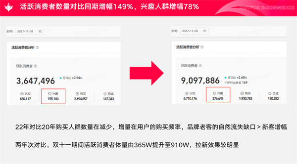 其中,發現人群增長270萬、種草人群增長9萬、互動人群增長3.5萬、行動人群增長2.7萬、首購人群增長3.3萬、復購人群增長0.6萬、至愛人群增長0.2萬、站內廣告投產1:7。
